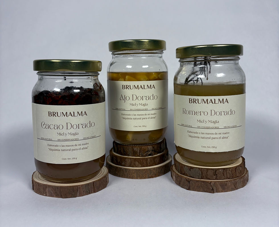 Infusionadas con hierbas sagradas, raíces o semillas. Estas mieles no solo nutren el cuerpo, sino que elevan la vibración, equilibran emociones y sostienen procesos de sanación natural.